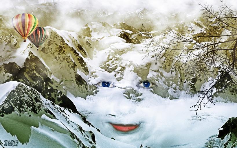 Keywords: mountain face escalation mountains peak portrait person women rock fog clouds calm ascension fantasy handling photoshop eyes blue lips