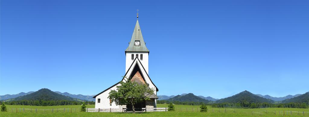 Keywords: mountain panorama steeple church religion sky blue freedom distant horizon allgäu landscape meadow bergdorf summer mountains grass