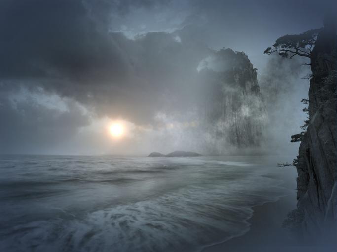 Keywords: mountain sea water ocean mystical surreal fog haze magical fairytale futuristic alie blue sky sun clouds atmospheric evening sky