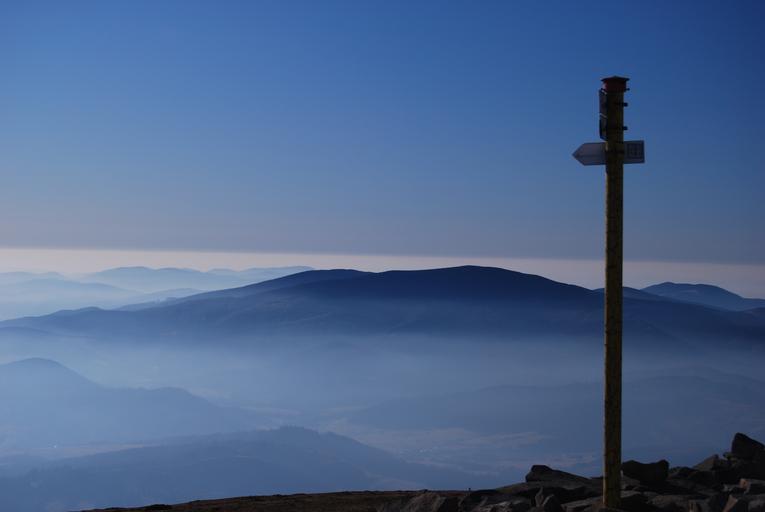 Keywords: mountains clouds the fog tops top view landscape sky babia top top sign pole signpost