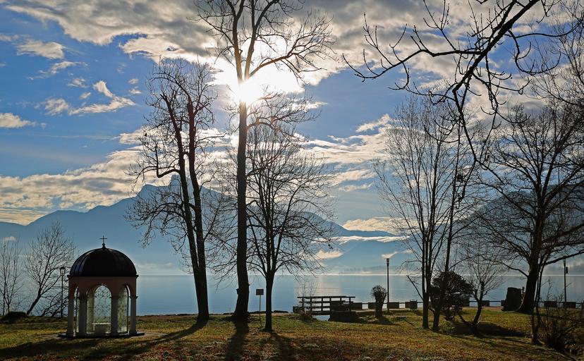 Keywords: mountains lake landscape abendstimmung mirroring sunrise austria view nature clouds sky weather outlook trees shrubs sun twilight plant alpine chapel green leaves autumn meadow grass bank