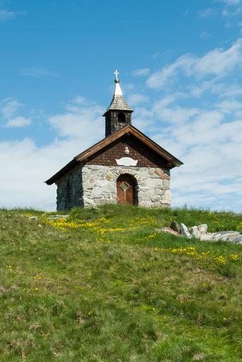 Keywords: mountains landscape nature chapel summer alpine sky meadow
