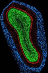 Keywords: Mouse MOB three color.jpg A coronal section through the main olfactory bulb of an adult male mouse strain C57BL/6j Image taken with a confocal microscope visualizing all cell nuclei with stain TOTO-3 False color applied with photoshop to indicate the three main anatomical layers Blue - Glomerular layer containing periglomerular juxtaglomerular cell bodies Red - External Plexiform layer and Mitral cell layer containing cell bodies of mitral and tufted cells and granule cells resident in mitral cell layer Green - Internal plexiform and granule cell layer containing cell bodies of immature migrating neuroblasts and mature granule cells Released by author 2006-08-15 Matt Valley Own work all rights released to Public Domain Confocal microscopic images Olfactory bulb TOTO-3 |