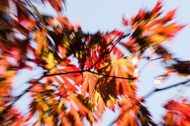 Keywords: movement leaves colorful color japanese maple yellow red brown recoloring the leaves yellowish red dye anthocyanin zoomed sun sky blue autumn
