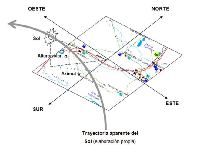 | Keywords: Movimiento Solar.png es Necesitamos referenciar las posiciones relativas del Sol y Tierra y por simplicidad se adopta el modelo en el que se supone que el Sol describe un movimiento aparente de rotación en torno a la Tierra Conviene recordar las diferencias entre hora solar y hora civil La primera es cuando el Sol pasa por el plano que contiene el meridiano del lugar es decir coincide con el cenit recta imaginaria que une el centro de la Tierra con el observador en la superficie en lo que se llama mediodía solar La hora oficial local tiene correcciones sobre la hora solar que incluyen la diferencia de meridianos sobre los que se encuentra el observador y el que se usa como referencia para la hora oficial otra corrección que recoge la llamada ecuación del tiempo que corrige el efecto de las perturbaciones en la velocidad de la Tierra y el Sol y por último la que los gobiernos suelen incluir de forma artificiosa atendiendo a consideraciones de ahorro energético El análisis de la posición relativa del Sol respecto de una superficie cualquiera ligada a la Tierra precisa la elección de un sistema de referencia para lo cual se elige un sistema inercial con origen en el punto de la superficie terrestre donde se encuentra el observador own EUDE Cc-zero Sun Diagrams in Spanish |