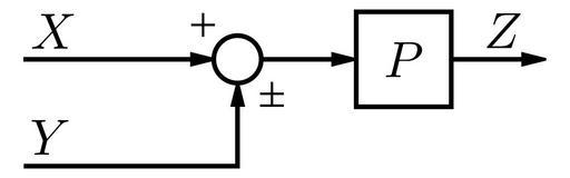 Keywords: Moving Summing Junction beyond Block 1.svg control theory sense showing a combination of summing junctions implementing <math>Z P X \pm Y </math> Own Inductiveload 2009-03-10 Control theory