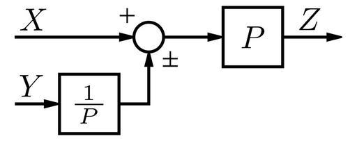 Keywords: Moving Summing Junction in front of Block 2.svg control theory sense showing a combination of summing junctions implementing <math>Z PX \pm Y</math> Own Inductiveload 2009-03-10 Control theory