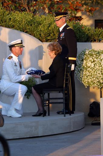 | Keywords: Mrs. Reagan.jpg Commanding Officer USS Ronald Reagan CVN 76 Capt James A Symonds presents former President Ronald Reagan's casket flag to former First Lady Nancy Reagan Simi Valley Calif Jun 11 2004 - Commanding Officer USS Ronald Reagan CVN 76 Capt James A Symonds presents former President Ronald Reagan's casket flag to former First Lady Nancy Reagan during internment services held at the Ronald Reagan Presidential Library in Simi Valley Calif The flag was flown at former President Ronald Reagan's inauguration The observance concluded the weeklong state funeral services for Ronald Reagan 40th President of the United States who passed away on June 5 2004 2004-06-11 040611-N-1450G-046 Navy http //www navy mil/view_image asp id 14896 U S Navy photo by Photographer's Mate 1st Class Jon D Gesch PD-USGov-Military-Navy <gallery>File Mrs Reagan is presented with flag jpg</gallery> Nancy Reagan after 1989 Sailors from the United States Navy Death and state funeral of Ronald Reagan Genuflection People with flags of the United States James Symonds |