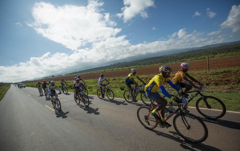 | Keywords: vehicle bike outdoor sport KENYA, Laikipia: In a photograph taken by Make it Kenya 24 November 2015, riders cycle in a group downhill towards Timau town in Laikipia County, 250km north of the Kenyan capital Nairobi, on the fourth and final day of the Mt. Kenya Epik cycling challenge. The 4-day mountain biking adventure challenge race circumnavigates the Mount Kenya region and this inaugural event attracted both Kenyan and international riders from as a far afield as Norway and Japan. The Epik was established to attract sports tourism to the Mt. Kenya region and showcase what it has to offer the outdoor, extreme sports enthusiast while providing riders the opportunity to interact with local communities and witness some of the beautiful scenery and landscapes surrounding Mt. Kenya that otherwise might not seen. The two-man team of Kenyan riders Joseph Echuwa and Samwel Mwangi won the 300km, 4-day race crossing the finish line in 10hrs 31mins and 05secs. MANDATORY CREDIT MAKE IT KENYA PHOTO / STUART PRICE. KENYA, Laikipia: In a photograph taken by Make it Kenya 24 November 2015, riders cycle in a group downhill towards Timau town in Laikipia County, 250km north of the Kenyan capital Nairobi, on the fourth and final day of the Mt. Kenya Epik cycling challenge. The 4-day mountain biking adventure challenge race circumnavigates the Mount Kenya region and this inaugural event attracted both Kenyan and international riders from as a far afield as Norway and Japan. The Epik was established to attract sports tourism to the Mt. Kenya region and showcase what it has to offer the outdoor, extreme sports enthusiast while providing riders the opportunity to interact with local communities and witness some of the beautiful scenery and landscapes surrounding Mt. Kenya that otherwise might not seen. The two-man team of Kenyan riders Joseph Echuwa and Samwel Mwangi won the 300km, 4-day race crossing the finish line in 10hrs 31mins and 05secs. MANDATORY CREDIT MAKE IT KENYA PHOTO / STUART PRICE. |