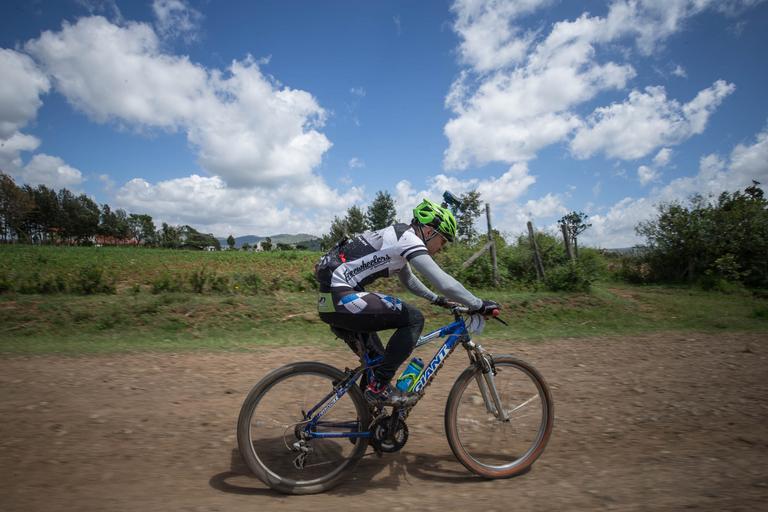 Keywords: bike outdoor vehicle sport motorcycle wheel KENYA, Meru: In a photograph taken by Make It Kenya 22 Novemebr 2015, a rider of a two-man cycling team cycles through rural farmland on day two of the Mt Kenya Epik cycling challenge near the town of Timau in Meru County, 250km north of the Kenyan capital Nairobi. The cycling challenge, taking place between 21-24 November, has over 30 cyclists both local and international professionals covering more than 300km through central Kenya. David Kinjah, Epik founder and training partner to two-time Tour-De France champion Chris Froome, hopes the event creates awareness of conservation projects around the Mt. Kenya region, which address the issues arising as a result of human-wildlife conflict and management of natural resources, particularly in water catchment areas. Kinjah who recently came back from the Cairo-Cape cycling challenge said that the Epik is a good opportunity to further engage the youth of the country and provide them with a platform to be involved in something worthwhile. "Kenyan cycling is still at the grassroots level and that's a good thing," Kinjah said adding that young cyclists come from rural areas and are enthusiastic about a sport that looks to have a bright future in the East AFrican country. MANDATORY CREDIT: MAKE IT KENYA PHOTO / STUART PRICE. KENYA, Meru: In a photograph taken by Make It Kenya 22 Novemebr 2015, a rider of a two-man cycling team cycles through rural farmland on day two of the Mt Kenya Epik cycling challenge near the town of Timau in Meru County, 250km north of the Kenyan capital Nairobi. The cycling challenge, taking place between 21-24 November, has over 30 cyclists both local and international professionals covering more than 300km through central Kenya. David Kinjah, Epik founder and training partner to two-time Tour-De France champion Chris Froome, hopes the event creates awareness of conservation projects around the Mt. Kenya region, which address the issues arising as a result of human-wildlife conflict and management of natural resources, particularly in water catchment areas. Kinjah who recently came back from the Cairo-Cape cycling challenge said that the Epik is a good opportunity to further engage the youth of the country and provide them with a platform to be involved in something worthwhile. "Kenyan cycling is still at the grassroots level and that's a good thing," Kinjah said adding that young cyclists come from rural areas and are enthusiastic about a sport that looks to have a bright future in the East AFrican country. MANDATORY CREDIT: MAKE IT KENYA PHOTO / STUART PRICE.