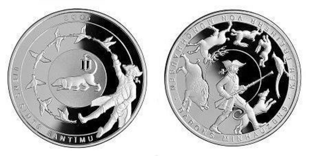 Keywords: Muenchhausen-1lats.jpg Baron Münchhausen - 1 Lats 2005 Weight 31 47 g Diameter 38 61 mm Metal silver fineness 925 Quality proof Artists Arvids Priedite graphic design Janis Strupulis plaster model Obverse A dog with a lantern tied to its tail is depicted on a dull surface in the central field of the coin It is surrounded by a row of seven flying ducks with Baron Münchhausen clutching at the last one against a smooth background The inscription 2005 is arranged in a semicircle at the top of the coin; a semicircular inscription VIENS SIMTS SANTĪMU one hundred santims is in the left lower part of the coin Reverse The images of Baron Münchhausen's stories are depicted in a circle against a smooth background the Baron himself with a rifle in his hands and a hunting dog at his feet a pheasant two hares a deer and a wild boar They are encircled by inscriptions BARONS MINHAUZENS and K F H FREIHERR VON M NCHHAUSEN separated by a dot against a dull background Edge Inscriptions LATVIJAS BANKA Bank of Latvia and LATVIJAS REPUBLIKA Republic of Latvia separated by a dot 2005 Coin The Bank of Latvia <br>Photo own Coin The Bank of Latvia<br> Photo UrSuS Coin Latvian coins Photo Commemorative coins of Latvia Boar hunting in art Baron Münchhausen Jānis Strupulis Arvids Priedite Dogs on coins |