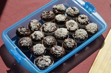 Keywords: muffins schokomuffins delicious confectionery calories treat sweet pastries small cakes sweetness children delicacy benefit from saje candy schokoladenmuffins tart coconut flakes strewn birthday cake fine pastry brown