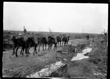 Keywords: blackandwhite monochrome outdoor photo border animal black and white Pairs of mules carrying ammunition for New Zealand artillery on the Ypres Salient during World War I. The shells are contained in divided bags. Each pack mule carries four shells on each side. Shows the wet conditions in the area. The mule track is muddy and there are pools of water on either side. Photograph taken Kansas Farm 12 October 1917 by Henry Armytage Sanders. Inscriptions: Inscribed - Photographer's title on negative -bottom right: H0301. Quantity: 1 b&w original negative(s). Physical Description: Dry plate glass negative 4.75 x 6.5 inches Mules carrying ammunition to the New Zealand guns on the Western Front, World War I. Royal New Zealand Returned and Services' Association :New Zealand official negatives, World War 1914-1918. Ref: 1/2-012944-G. Alexander Turnbull Library, Wellington, New Zealand. natlib.govt.nz/records/22762316 Pairs of mules carrying ammunition for New Zealand artillery on the Ypres Salient during World War I. The shells are contained in divided bags. Each pack mule carries four shells on each side. Shows the wet conditions in the area. The mule track is muddy and there are pools of water on either side. Photograph taken Kansas Farm 12 October 1917 by Henry Armytage Sanders. Inscriptions: Inscribed - Photographer's title on negative -bottom right: H0301. Quantity: 1 b&w original negative(s). Physical Description: Dry plate glass negative 4.75 x 6.5 inches Mules carrying ammunition to the New Zealand guns on the Western Front, World War I. Royal New Zealand Returned and Services' Association :New Zealand official negatives, World War 1914-1918. Ref: 1/2-012944-G. Alexander Turnbull Library, Wellington, New Zealand. natlib.govt.nz/records/22762316 |
