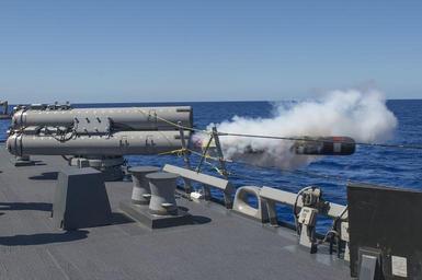Keywords: Multi-Sail 2015 150323-N-BB269-219.jpg en 150323-N-BB269-219 WATERS NEAR GUAM March 23 2015 Arleigh Burke-class guided-missile destroyer USS Curtis Wilbur DDG 54 fires a torpedo at a simulated target during Multi-Sail 2015 Multi-Sail 2015 is an annual Destroyer Squadron 15 exercise designed to assess combat systems improve teamwork and increase warfighting capabilities in the Seventh Fleet area of responsibility U S Navy photo by Mass Communication Specialist 3rd Class Raymond D Diaz III/Released 2015-03-23 Petty Officer 3rd Class Raymond Diaz III https //www dvidshub net/image/1835736 150323-N-BB269-219 2015-03-24 17 58 USS CURTIS WILBUR AT SEA PD-USGov-Military-Navy USS Curtis Wilbur DDG-54 Multi-Sail 2015 Images from DoD uploaded by Fæ |