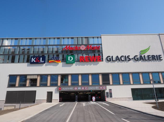 Keywords: multi storey car park gateway park shopping centre shopping shoppingmall mall shopping center retail stores service outlets sectors advertising advertising signs advertisement rewe dm k l media markt glacis gallery new ulm