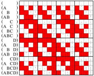 | Keywords: Multigrade operator NXNOR.svg Negated biconditionals of the arguments in the parentheses to the left of the matrix Red squares stand for binary ones respectively for true 120 of 256 squares are red own 2010 Mate2code Related files User Boolean Algebra/Multigrade operator examples <br clear all> Truth tables Binary square matrices in logic Walsh matrix of order 16 |