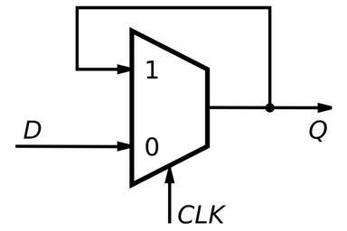 Keywords: Multiplexer-based latch (negative).svg en A negative latch i e transparent when CLK 0 constructed using a multiplexer <math>Q \overline CLK \cdot Q + CLK \cdot D</math> own Inductiveload 2009-11-12 Flip-flops