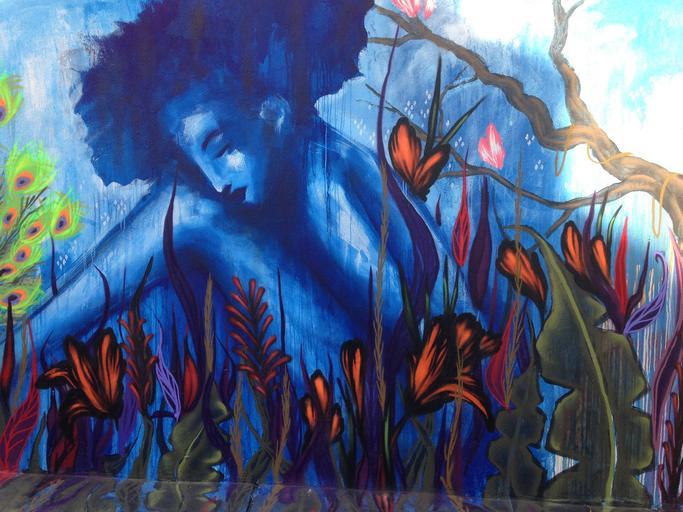 Keywords: mural art painting graffiti paint painted street city artistic exterior creative woman flowers floral blue