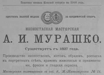 | Keywords: Murashko Oleksandr Ivanovych, advertising studio, 1900.jpg en Murashko Oleksandr Ivanovych advertise iconostasis workshop 1900 uk Реклама іконостасної майсте ні у ашка Олександ а Івановича 1900 ік 2013-07-12 22 06 32 http //oldbooks ax3 net/BookLibrary/16001-Pam -knizhki-Kievskoy-gub/1899 -Pamyatnaya-knizhka-Kievskoy-gubernii-na-1900-god -18-y-god html Памятная книжка Киевской губе нии на 1900 год Київський Губе нський статистичний комітет Custom license marker 2013 07 12 PD-old Uploaded with UploadWizard Oleksandr Murashko |