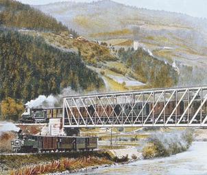 Keywords: Murtalbahn Unzmarkt hist2.jpg A train on the narrow gauge Murtalbahn meeting a standard gauge train passing the bridge over river Mur at Unzmarkt coloured picture postcard based on B/W photograph<br> Ein Zug der schmalspurigen Murtalbahn begegnet einem Zug der Normalspurbahn auf der Murbrücke bei Unzmarkt Kolorierte Postkarte auf Grundlage einer Schwarz-Weiß-Fotografie historic picture postcard ca 1900 Author public domain Anonymous-EU Murtalbahn Iron truss beam bridges Iron truss railway bridges in Austria Unzmarkt-Frauenburg Hand-colored photographs Bridges over the Mur River in Austria Postcards of Austria before 1918 Postcards of Styria Mur River in art |