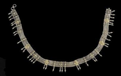 Keywords: Musa - Girdle - Walters 572325.jpg The girdle is made of a flexible interlace mesh and has eleven movable retainers with large rhombic attachments each with two tear-shaped pendants and twelve retainers with smaller rhombic attachments each with one pendant All attachments were cast Small rings and rosettes frame the large rhombic elements and three-ring motif with burling rosettes accompany the smaller ones at their top and bottom The clasps are also decorated with a large rhombic elements A wire shaped in a figure-eight with a rosette is used as a closing element On the front of the clasps is an Arabic stamp with the name of the ruler and a date al-Mahdi 1170 The similarity to stamps of al-Mahdi al- Abbas makes it likely that the pendants were produced under his reign from AH 1161 to 1189 AD 1748-1775 An engraved inscription on the back of the clasp names the silversmith Musa Iraqi For another object by Musa Iraqi see Walters 57 2321 1170 AH/AD 1756-1757 silver with gilding L 34 x W 1 in 86 3 x 2 6 cm accession number 57 2325 80929 Mr Benjamin Zucker Zucker Family Trust and Mr Derek Content New York and London by purchase Walters Art Museum Joint gift to the Walters Art Museum Baltimore and the Israel Museum Jerusalem by Mr Benjamin Zucker and Mr Derek Content in honor of Mrs Barbara Zucker and Mrs Amanda Content 2010 Stamp Arabic al-Mahdi 1170 Engraving Hebrew Musa Iraqi place of origin Yemen Walters Art Museum license Jewellery in the Walters Art Museum South Arabian art in the Walters Art Museum Musa Iraqi Media contributed by the Walters Art Museum needs category review |