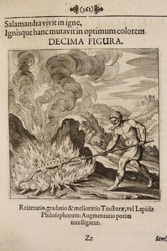Keywords: Musaeum Hermeticum 1678 p 361 Fire 0053.JPG Matthaeus Merian 1593 “1650 Figure 10 from Lambsprinck's De Lapide Philosophico On the Philosopher's Stone as published in the Musaeum hermeticum reformatum et amplificatum Francofurti Apud Hermannum à Sande 1678 In Latin The caption on the figure reads Salamandra vivit in igne Ignisque hanc mutavit in optimum colorem DECIMA FIGURA Reiteratie gradatio melioratio Tincturae vel Lapidis Philosophorum Augmentatio potius intelligatur Roughly translated Salamander lives in the fire the fire this has changed in the best color / Tenth Figure / Repetition scale and the betterment of the dyes or the Philosophers Stone an augmentation is rather meant A man stands next to a fire using a trident to poke a salamander in the fire In the background past a river on a mountain stands a castle Alchemy has always been closely associated with metallurgy one of mankind ™s most ancient chemical industries In fact alchemy grew out of the trade secrets of ancient metallurgists In the medieval period alchemists developed sophisticated powerful techniques to separate and purify metals Chemical manipulation of precious metals was the most notable example of alchemy ™s mastery and the most promising evidence for the possibility of transmutation http //othmerlib chemheritage org/record b1035996~S6 Catalog Information From the copy in the Roy G Neville Historical Chemical Library http //www chemheritage org/ Chemical Heritage Foundation Downloaded with permission from the Chemical Heritage Foundation as part of the Wikipedian in Residence initiative Chemical Heritage Foundation http //www chemheritage org/ Chemical Heritage Foundation 1678 PD-old-100 PD-old-100 cc-by-3 0 Chemical Heritage Foundation Images from the Chemical Heritage Foundation Philosopher's stone Matthäus Merian Musaeum Hermeticum Lambsprinck |