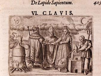 Keywords: Musaeum Hermeticum 1678 VI. Clavis AQ34 Key 6.tif Matthaeus Merian 1593 “1650 From Tripus aureus hoc est Tres tractatus chymici selectissimi nempe I Basilii Valentini benedictini ordinis monachi Germani practica una cum 12 clavibus et appendice ex germanico; II Thomae Nortoni angli philosophi crede mihi seu ordinale ante annos 140 ab authore seriptum nunc ex anglicano manuscripto in latinum translatum phrasi eujusque authoris ut et sententia retenta; III Cremeri cuiusdam abbatis westmonasteriensis angli testamentum hactenus nondum publicatum nunc in diversarum nationum gratiam editi et figuris cupro affabre incisis ornati operâ et studio Michaelis Maieri phil et med d com p c Francofurti apud Hermannum à Sande MDCLXXVII as published in the collection Musaeum hermeticum reformatum et amplificatum Francofurti Apud Hermannum à Sande 1678 In Latin The part in question 'I Basilii Valentini benedictini ordinis monachi Germani practica una cum 12 clavibus et appendice ex germanico;' or 'Basil Valentine a German monk of the Benedictine order one study with the twelve keys and the appendix translated from the German ' At the center of the picture is a bishop right hand raised to bless the wedding of a King left and Queen right They stand under a dark cloud from which heavy rain is falling Above the cloud forms a rainbow To the left of the King is the Sun and on the right of the Queen is a crescent Moon Below the sun is a swan or goose On the left near the King is a cylindrical vessel is being heated on a fire The top of the vessel is a double-faced head from whose mouths come collecting flasks The top of the head has flames for hair To the right of the Queen stands an alchemist with a trident pouring water from a flask into a water bath in which an alembic or retort is being heated atop a furnace The fumes which are emitted condense and are collected in a flask below which contains a layer of liquid http //othmerlib chemheritage org/record b1035996~S6 Catalog Information From the copy in the Roy G Neville Historical Chemical Library http //www chemheritage org/ Chemical Heritage Foundation Downloaded with permission from the Chemical Heritage Foundation as part of the Wikipedian in Residence initiative Chemical Heritage Foundation http //www chemheritage org/ Chemical Heritage Foundation 1678 PD-old-100 PD-old-100 cc-by-3 0 Chemical Heritage Foundation Musaeum Hermeticum Archives Images from the Chemical Heritage Foundation Twelve Keys of Basil Valentine PD-old-100 |