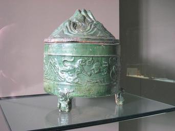 | Keywords: Musée Cernuschi - small pot.JPG Musée Cernuschi Paris France - small pot The original work is old enough so that copyright if any has long since expired The museum imposed no restrictions on photography except prohibiting flash in writing and when I explicitly asked; thus the original image appears free of copyright restrictions Vase weijiuzun pour chauffer les boissons fermentées Couvercle représentant l'ïle des immortels taoïstes boshanlu Han de l'Est Musée Cernuschi Paris MC 7789 Achat 1932 own I took this photograph 2008-02-07 Daderot Own work all rights released Public domain Ceramics of the Eastern Han Dynasty Art of China in the Musée Cernuschi Chinese celadon jars Ceramic jars celadon Hill jars ceramics Archaeological cosmetic containers |