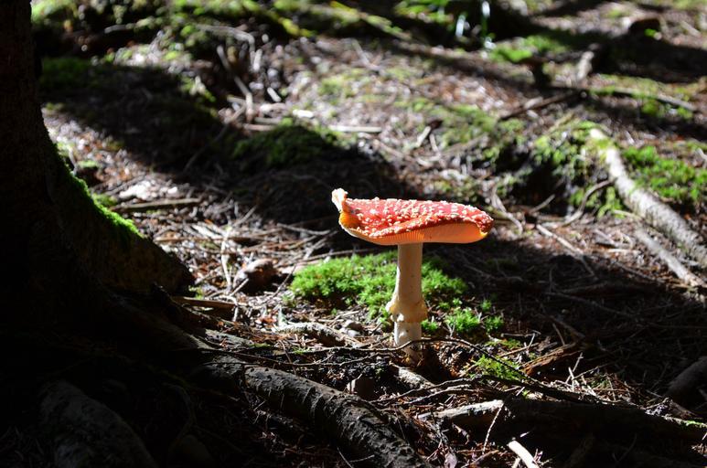 Keywords: mushroom fly agaric red fly agaric mushroom fungal species toadstool gift toxic red white hat stalk points spotted lamellar moss forest forest floor autumn nature light shadow shadow play