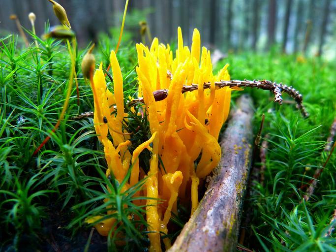 Keywords: mushroom goatee coral-like plant clavaria corniculata moss autumn close yellow