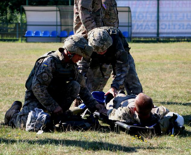 Keywords: outdoor sport team sport YAVORIV, Ukraine - Soldiers of 1st Battalion, 93rd Mechanized Brigade put a hypothermia blanket on a casualty to lower the wounded Soldiers body temperature during combat lifesaver exercise, August 5, 2016. Soldiers of 6th Squadron, 8th Cavalry Regiment, 2nd Infantry Brigade Combat Team, 3rd InfantryDivision conducted the exercise to show Ukrainian Soldiers how to treat wounded Soldiers in combat. Soldiers of 6-8 Cav are here in support of the Joint Multinational Training Group-Ukraine. JMTG-U is responsible for training Ukrainian land forces and building a team of Ukrainian cadre who will ultimately assume that responsibility. The training is designed to reinforce defensive skills of the Ukrainian Ground Forces in order to increase their capacity for self-defense (U.S.Army photo by Spc. John Onuoha / Released) YAVORIV, Ukraine - Soldiers of 1st Battalion, 93rd Mechanized Brigade put a hypothermia blanket on a casualty to lower the wounded Soldiers body temperature during combat lifesaver exercise, August 5, 2016. Soldiers of 6th Squadron, 8th Cavalry Regiment, 2nd Infantry Brigade Combat Team, 3rd InfantryDivision conducted the exercise to show Ukrainian Soldiers how to treat wounded Soldiers in combat. Soldiers of 6-8 Cav are here in support of the Joint Multinational Training Group-Ukraine. JMTG-U is responsible for training Ukrainian land forces and building a team of Ukrainian cadre who will ultimately assume that responsibility. The training is designed to reinforce defensive skills of the Ukrainian Ground Forces in order to increase their capacity for self-defense (U.S.Army photo by Spc. John Onuoha / Released)