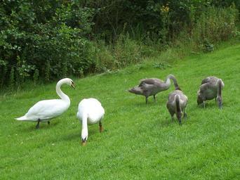 Keywords: mute swan family cygnus olor swans waterfowl cob pen signets white grey plumage webbed feet grassy bank