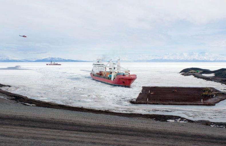 Keywords: MV Ocean Giant at McMurdo Station ice pier in January 2015.JPG en The U S Military Sea-Lift Command chartered container ship MV Ocean Giant makes its approach to the ice pier at McMurdo Station prior to the start of port cargo handling evolutions in support of Operation Deep Freeze 2015 Deep Freeze is an annual U S Pacific Air Forces-led joint interagency mission to provide logistical and transportation support to the National Science Foundation and the U S Antarctic Program USAP Joint Task Force-Support Forces Antarctica coordinates strategic inter-theater airlift tactical deep field support aeromedical evacuation support search and rescue response sealift seaport access bulk fuel supply port cargo handling and transportation requirements for USAP 2015-01-25 150125-N-ZZ999-002 Navy http //www navy mil/view_image asp id 193793 U S Navy photo by SN Mumbali Ngwa PD-USGov-Military-Navy Operation Deep Freeze McMurdo Station Ships in Antarctica |