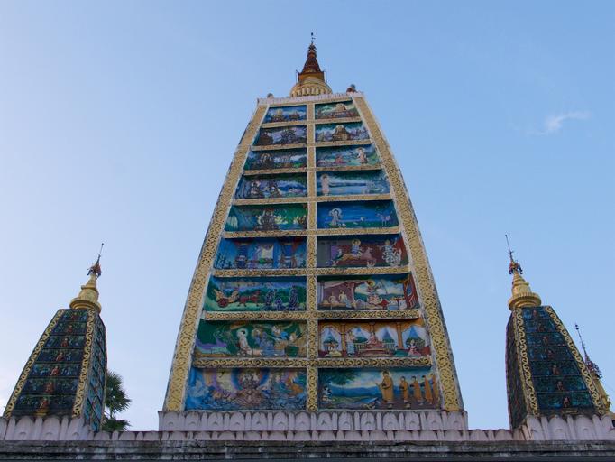 Keywords: architecture asia bâtiment birman birmanie buddhist burma golden myanmar pagodas rangoon rangoun shwedagon sky stupa temple www.wbayer.com wwwwbayercom building outdoor skyscraper tower La pagode est située à 2 km du centre ville de Yangon, au n°1, Shwedagon Pagoda Road. Elle repose sur une plate-forme pavée de marbre de 5,6 hectares, au sommet de la colline de Singuttara, à 51 m au-dessus de la ville. Elle domine l'horizon. On y accède par des escaliers et des ascenseurs situés aux quatre points cardinaux. Deux chinthes (lions mythiques) monumentaux gardent l'entrée sud ; ils ont été offerts par roi Tharrawaddy lors de sa visite en 18418. La pagode principale se trouve au milieu d'un vaste complexe de 72 autres pagodes, pagodons, salles de prières, tazaungs, pyatthats9 et autres édifices religieux à l'architecture typiquement birmane, ainsi que de très nombreuses statues de bouddhas et de nats. Le stûpa atteint la hauteur de 98 mètres. Sa base est faite de briques recouvertes de milliers de plaques d'or. Elle est entourée d'une forêt de 64 petits pagodons10 qui forment une petite enceinte avec 4 temples plus grands situés aux points cardinaux. Sur la flèche se trouve une sorte d'ombrelle, appelée le hti en birman où sont accrochées 1065 clochettes d'or et 420 clochettes d'argent11, ainsi qu'une girouette ornée de pierres précieuses. Elle se termine par le seinbu, une petite sphère d'or incrustée de milliers de diamants12 dont une émeraude13 de 76 carats. La pagode est située à 2 km du centre ville de Yangon, au n°1, Shwedagon Pagoda Road. Elle repose sur une plate-forme pavée de marbre de 5,6 hectares, au sommet de la colline de Singuttara, à 51 m au-dessus de la ville. Elle domine l'horizon. On y accède par des escaliers et des ascenseurs situés aux quatre points cardinaux. Deux chinthes (lions mythiques) monumentaux gardent l'entrée sud ; ils ont été offerts par roi Tharrawaddy lors de sa visite en 18418. La pagode principale se trouve au milieu d'un vaste complexe de 72 autres pagodes, pagodons, salles de prières, tazaungs, pyatthats9 et autres édifices religieux à l'architecture typiquement birmane, ainsi que de très nombreuses statues de bouddhas et de nats. Le stûpa atteint la hauteur de 98 mètres. Sa base est faite de briques recouvertes de milliers de plaques d'or. Elle est entourée d'une forêt de 64 petits pagodons10 qui forment une petite enceinte avec 4 temples plus grands situés aux points cardinaux. Sur la flèche se trouve une sorte d'ombrelle, appelée le hti en birman où sont accrochées 1065 clochettes d'or et 420 clochettes d'argent11, ainsi qu'une girouette ornée de pierres précieuses. Elle se termine par le seinbu, une petite sphère d'or incrustée de milliers de diamants12 dont une émeraude13 de 76 carats. |