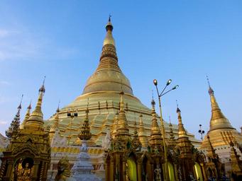Keywords: architecture asia bâtiment birman birmanie buddhist burma golden myanmar pagodas rangoon rangoun shwedagon sky stupa temple www.wbayer.com wwwwbayercom building roof outdoor tower La pagode est située à 2 km du centre ville de Yangon, au n°1, Shwedagon Pagoda Road. Elle repose sur une plate-forme pavée de marbre de 5,6 hectares, au sommet de la colline de Singuttara, à 51 m au-dessus de la ville. Elle domine l'horizon. On y accède par des escaliers et des ascenseurs situés aux quatre points cardinaux. Deux chinthes (lions mythiques) monumentaux gardent l'entrée sud ; ils ont été offerts par roi Tharrawaddy lors de sa visite en 18418. La pagode principale se trouve au milieu d'un vaste complexe de 72 autres pagodes, pagodons, salles de prières, tazaungs, pyatthats9 et autres édifices religieux à l'architecture typiquement birmane, ainsi que de très nombreuses statues de bouddhas et de nats. Le stûpa atteint la hauteur de 98 mètres. Sa base est faite de briques recouvertes de milliers de plaques d'or. Elle est entourée d'une forêt de 64 petits pagodons10 qui forment une petite enceinte avec 4 temples plus grands situés aux points cardinaux. Sur la flèche se trouve une sorte d'ombrelle, appelée le hti en birman où sont accrochées 1065 clochettes d'or et 420 clochettes d'argent11, ainsi qu'une girouette ornée de pierres précieuses. Elle se termine par le seinbu, une petite sphère d'or incrustée de milliers de diamants12 dont une émeraude13 de 76 carats. La pagode est située à 2 km du centre ville de Yangon, au n°1, Shwedagon Pagoda Road. Elle repose sur une plate-forme pavée de marbre de 5,6 hectares, au sommet de la colline de Singuttara, à 51 m au-dessus de la ville. Elle domine l'horizon. On y accède par des escaliers et des ascenseurs situés aux quatre points cardinaux. Deux chinthes (lions mythiques) monumentaux gardent l'entrée sud ; ils ont été offerts par roi Tharrawaddy lors de sa visite en 18418. La pagode principale se trouve au milieu d'un vaste complexe de 72 autres pagodes, pagodons, salles de prières, tazaungs, pyatthats9 et autres édifices religieux à l'architecture typiquement birmane, ainsi que de très nombreuses statues de bouddhas et de nats. Le stûpa atteint la hauteur de 98 mètres. Sa base est faite de briques recouvertes de milliers de plaques d'or. Elle est entourée d'une forêt de 64 petits pagodons10 qui forment une petite enceinte avec 4 temples plus grands situés aux points cardinaux. Sur la flèche se trouve une sorte d'ombrelle, appelée le hti en birman où sont accrochées 1065 clochettes d'or et 420 clochettes d'argent11, ainsi qu'une girouette ornée de pierres précieuses. Elle se termine par le seinbu, une petite sphère d'or incrustée de milliers de diamants12 dont une émeraude13 de 76 carats. |