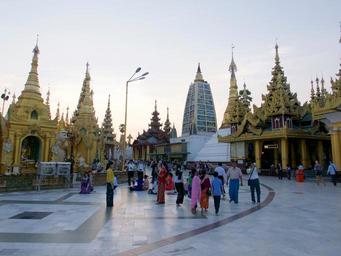 Keywords: architecture asia bâtiment birman birmanie buddhist burma golden myanmar pagodas rangoon rangoun shwedagon sky stupa temple www.wbayer.com wwwwbayercom outdoor La pagode est située à 2 km du centre ville de Yangon, au n°1, Shwedagon Pagoda Road. Elle repose sur une plate-forme pavée de marbre de 5,6 hectares, au sommet de la colline de Singuttara, à 51 m au-dessus de la ville. Elle domine l'horizon. On y accède par des escaliers et des ascenseurs situés aux quatre points cardinaux. Deux chinthes (lions mythiques) monumentaux gardent l'entrée sud ; ils ont été offerts par roi Tharrawaddy lors de sa visite en 18418. La pagode principale se trouve au milieu d'un vaste complexe de 72 autres pagodes, pagodons, salles de prières, tazaungs, pyatthats9 et autres édifices religieux à l'architecture typiquement birmane, ainsi que de très nombreuses statues de bouddhas et de nats. Le stûpa atteint la hauteur de 98 mètres. Sa base est faite de briques recouvertes de milliers de plaques d'or. Elle est entourée d'une forêt de 64 petits pagodons10 qui forment une petite enceinte avec 4 temples plus grands situés aux points cardinaux. Sur la flèche se trouve une sorte d'ombrelle, appelée le hti en birman où sont accrochées 1065 clochettes d'or et 420 clochettes d'argent11, ainsi qu'une girouette ornée de pierres précieuses. Elle se termine par le seinbu, une petite sphère d'or incrustée de milliers de diamants12 dont une émeraude13 de 76 carats. La pagode est située à 2 km du centre ville de Yangon, au n°1, Shwedagon Pagoda Road. Elle repose sur une plate-forme pavée de marbre de 5,6 hectares, au sommet de la colline de Singuttara, à 51 m au-dessus de la ville. Elle domine l'horizon. On y accède par des escaliers et des ascenseurs situés aux quatre points cardinaux. Deux chinthes (lions mythiques) monumentaux gardent l'entrée sud ; ils ont été offerts par roi Tharrawaddy lors de sa visite en 18418. La pagode principale se trouve au milieu d'un vaste complexe de 72 autres pagodes, pagodons, salles de prières, tazaungs, pyatthats9 et autres édifices religieux à l'architecture typiquement birmane, ainsi que de très nombreuses statues de bouddhas et de nats. Le stûpa atteint la hauteur de 98 mètres. Sa base est faite de briques recouvertes de milliers de plaques d'or. Elle est entourée d'une forêt de 64 petits pagodons10 qui forment une petite enceinte avec 4 temples plus grands situés aux points cardinaux. Sur la flèche se trouve une sorte d'ombrelle, appelée le hti en birman où sont accrochées 1065 clochettes d'or et 420 clochettes d'argent11, ainsi qu'une girouette ornée de pierres précieuses. Elle se termine par le seinbu, une petite sphère d'or incrustée de milliers de diamants12 dont une émeraude13 de 76 carats. |