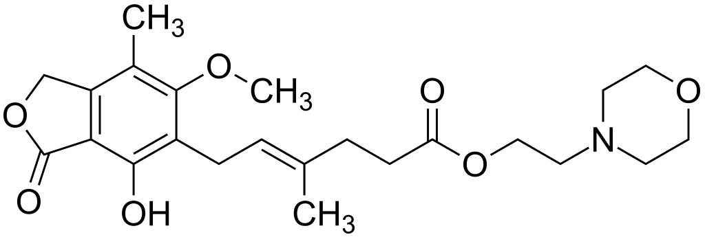 | Keywords: Mycophenolate Mofetil 200.svg validSVG Structure of E -2-morpholinoethyl 6- 4-hydroxy-6-methoxy-7-methyl-3-oxo-1 3-dihydroisobenzofuran-5-yl -4-methylhex-4-enoate Own 2014-04-30 Emeldir <span class signature-talk >talk</span> Chemical structure verified https //upload wikimedia org/wikipedia/commons/6/68/Mycophenolate_Mofetil_200 svg 1S/C23H31NO7/c1-15 5-7-19 25 30-13-10-24-8-11-29-12-9-24 4-6-17-21 26 20-18 14-31-23 20 27 16 2 22 17 28-3/h4 26H 5-14H2 1-3H3/b15-4+ RTGDFNSFWBGLEC-SYZQJQIISA-N 128794-94-5 Synonyms <small> E -6- 1 3-dihydro-4-hydroxy-6-methoxy-7-methyl-3-oxo-5-isobenzofuranyl -4-methyl-4-hexenoic acid 2- 4-morpholinyl ethyl ester 2-morpholin-4-ylethyl E -6- 4-hydroxy-6-methoxy-7-methyl-3-oxo-1H-2-benzofuran-5-yl -4-methylhex-4-enoate CellCept ME MPA Munoloc Mycophenolate mofetil Mycophenolate Mofetil Mycophenolate mofetil Generic CellCept Mycophenolic acid morpholinoethyl ester Mycophenolic acid-2- 4-Morpholinyl ethyl ester R99 RS 61443</small> PD-chem Phthalides Morpholines Methyl ethers Carboxylate esters |