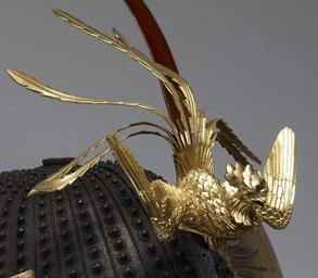 | Keywords: Myochin - Helmet with Phoenix and Battle-Axe Ornaments - Walters 51609 - Detail A.jpg  This helmet has an iron hachi of thirty-three riveted laminations a shikoro of five plates laced in kebiki spread hair style with navy blue ito doshi laces and axes as yokodate made from whale baleen A Phoenix Ho o serves as a maedate; one tail feather is missing It is lined with rawhide between 1825 1875 late Edo iron lacquer silk wood baleen rawhide cm 29 2 accession number 51 609 33679 Bunkio Matsuki Sale A A Gallery New York February 10 1906 no 257 Henry Walters Baltimore February 10 1906 by purchase Walters Art Museum Henry Walters Acquired by Henry Walters 1906 place of origin Japan Walters Art Museum license Maedate Suji bachi kabuto Za-boshi kabuto Japanese armour in the Walters Art Museum Myochin family |