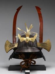 | Keywords: Myochin - Helmet with Phoenix and Battle-Axe Ornaments - Walters 51609.jpg  This helmet has an iron hachi of thirty-three riveted laminations a shikoro of five plates laced in kebiki spread hair style with navy blue ito doshi laces and axes as yokodate made from whale baleen A Phoenix Ho o serves as a maedate; one tail feather is missing It is lined with rawhide between 1825 1875 late Edo iron lacquer silk wood baleen rawhide cm 29 2 accession number 51 609 33679 Bunkio Matsuki Sale A A Gallery New York February 10 1906 no 257 Henry Walters Baltimore February 10 1906 by purchase Walters Art Museum Henry Walters Acquired by Henry Walters 1906 place of origin Japan Walters Art Museum license Maedate Wakidate Suji bachi kabuto Za-boshi kabuto Japanese armour in the Walters Art Museum Myochin family |