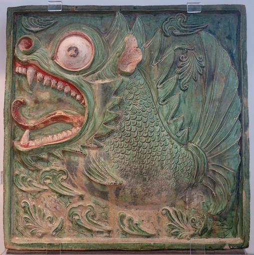 Keywords: Mythical fish Makara tomb tile, China, 550-600 AD, glazed earthenware - Royal Ontario Museum - DSC04071.JPG en Exhibit in the Royal Ontario Museum Toronto Ontario Canada This work is old enough so that it is in the public domain Photography was permitted in the museum without restriction 2013-10-08 14 39 17 own Daderot cc-zero Chinese tomb tiles in the Royal Ontario Museum Uploaded with UploadWizard Makara in China |