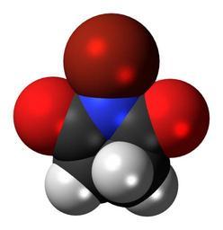 Keywords: N-Bromosuccinimide 3D spacefill.png Space-filling model of the N-bromosuccinimide molecule a source of cationic bromine Colour code 505050 Carbon C black<br> F0F0F0 Hydrogen H white<br> F51E1E Oxygen O red<br> 3C50FA Nitrogen N blue<br> B42814 Bromine Br red-brown<br> 2011-07-03 own DS Visualizer Jynto talk Ball-and-stick version cc-zero Images by Jynto N-Bromosuccinimide Space-filling models |