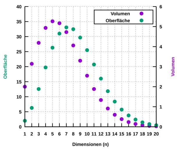 | Keywords: N-dimensionale einheitskugel surf-vol.svg de Oberfläche und Volumen der n-Dimensionalen Einheitskugel v gnuplot cvs reset set terminal svg fname 'Arial bold' fsize 15 lw 2 set border 11 set key box set xrange 1 20 set yrange 0 40 set sample 20 set tics nomirror set xtics 1 set y2tics 1 set xlabel 'Dimensionen n ' set ylabel 'Oberfläche' tc lt 2 set y2label 'Volumen' tc lt 1 set grid set output 'sphere svg' plot pi x/2 / gamma 1 + x/2 w p pt 7 t 'Volumen' axes x1y2 \ 2 pi x/2 / gamma x/2 w p pt 7 t 'Oberfläche' unset output 2014-07-31 15 46 13 own StefanPohl cc-zero Uploaded with UploadWizard Check categories 2015 July 4 Spheres |