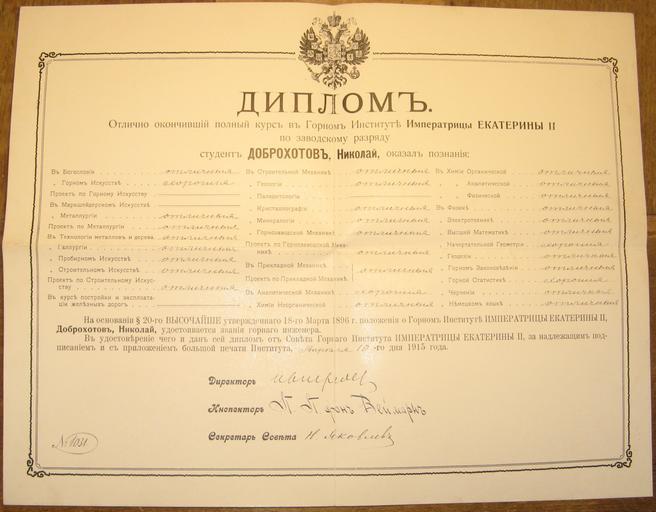| Keywords: N.N. Dobrokhotov`s Diploma of graduation from Mining Institute.jpg en N N Dobrokhotov`s Diploma of graduation from Mining Institute ru Диплом Доб охотова об окончании го ного института Kiev Home archive Kulich Fedor 2009-10-21 Check categories 2009 October 29 ru wikipedia Доб охотов _ иколай_ иколаевич Kyiv Arzamas 12 People of Arzamas History of Arzamas People of Nizhny Novgorod Oblast People of Kiev 1963 deaths Award winners 1889 births Documents in Russian Educational documents of the Russian Empire Metallurgists from the Soviet Union |