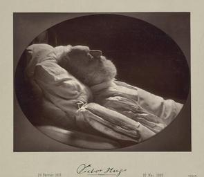Keywords: Nadar, Victor Hugo on His Deathbed - Getty Museum.jpg When the poet playwright and novelist Victor Hugo died in 1885 Nadar went to his deathbed to make a final image as a memorial of the great man Nadar's sketch of the death chamber showed that black drapery was tied across a window behind the bed and then to one of the bedposts in order to visually isolate Hugo's recumbent figure against a somber background For the photograph a mirror reflected light back from the window to provide detail in the shadow area During the 1800s Hugo was thought to be France's greatest writer He began to write while still a schoolboy and his poetry was first published at twenty His wildly popular novels soon followed Hugo's troubled personal life however stood in sharp contrast to his successful career His wife was conspicuously in love with another man his favorite daughter drowned and another went mad A talented amateur artist he was interested in photography and once contemplated illustrating a book of his poems with photographic negatives By the time of his death Hugo was revered his body lay in state under the Arc de Triomphe and he was buried in the Panthéon Paul Nadar made this print in the 1920s from his father's negative of 1885 1885 Woodburytype Image 18 7 x 24 4 cm 7 3/8 x 9 5/8 in Sheet 19 3 x 24 5 cm 7 5/8 x 9 5/8 in Mount 30 8 x 38 1 cm 12 1/8 x 15 in Institution Getty Museum object history exhibition history other versions 53927 Markings Verso mount wet stamp in blue ink Portraits / P Nadar / 45 Rue Bassano 48 / Teleph ELYSEES 7834 <br> Inscriptions Recto mount imprinted in black ink at center below image 26 Fevrier 1802 / Victor Hugo / 22 Mai 1885 credit line accession number 84 XM 1037 11 PD-100 Photographs of Victor Hugo 1885 Photographs of Victor Hugo by Nadar 1885 portrait photographs Deathbed portraits Photographs in the Getty Museum |