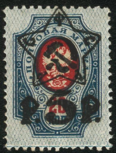 | Keywords: Nadpechatka RSFSR 5 rub na czarskoj marke 20 kop.jpg Postage stamp of Russian Empire 20 kopecks Overprinted by Russian SFSR as 5 rubles 1918 Почтовая ма ка РСФСР 1918 надпечатка 5 ублей на ца ской ма ке 20 копеек чистая ru ЦФА Sello zarista de 20 kopeks Resellado por la RSFS de Rusia por 5 rublos 1918 Originally scanned and upload by Vizu from personal collection Originally from ru wikipedia ru свой скан бумажных ма ок Post of Russian Soviet Federative Socialist Republic / ru Почта РСФСР 1918; 2008 original upload date PD-RU-exempt stamps PD-art Stamps of Russia 1918 Files uploaded by User Secretary Red stars on stamps 1918 stamps Stamps printed in Russian Empire area during Civil War Overprints on stamps of the Russian Empire Hammer and sickle on stamps Stamps of Russia to be categorised by subject |