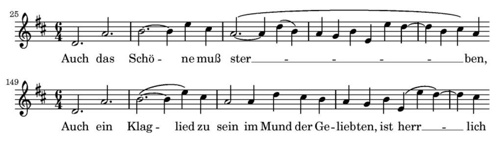| Keywords: Naenie-theme.png Excerpt from the soprano part in Brahms' Nänie 1881 Illustrates how the initial theme in bar 25 is used again in bar 149 Own 2007-02-11 Thomas Schultz music by Brahms who died more than 70 years ago; engraving is own work and hereby released into the public domain musical notation LilyPond source \version 2 10 13 \include deutsch ly << \set Score currentBarNumber 25 \relative \new Voice TeilA \set melismaBusyProperties ' \time 6/4 \key d \major \bar d2 a' h ~ h4 e cis a2 \ ~ a4 d h a g h e e' d ~ d h cis\ a \addlyrics Auch das Schö -- ___ ne muß ster -- __ _ _ _ _ _ _ _ _ _ _ _ _ ben >> << \set Score currentBarNumber 149 \relative \new Voice TeilB \set melismaBusyProperties ' \time 6/4 \key d \major \bar d2 a' h\ ~ h4 e\ cis a2 a4 d cis h a g h e \ e' d\ ~ d cis \addlyrics Auch ein Klag -- ___ lied zu sein im Mund der Ge -- lieb -- ten ist herr -- __ _ _ _ lich >> PD-old Sheet music of Johannes Brahms |