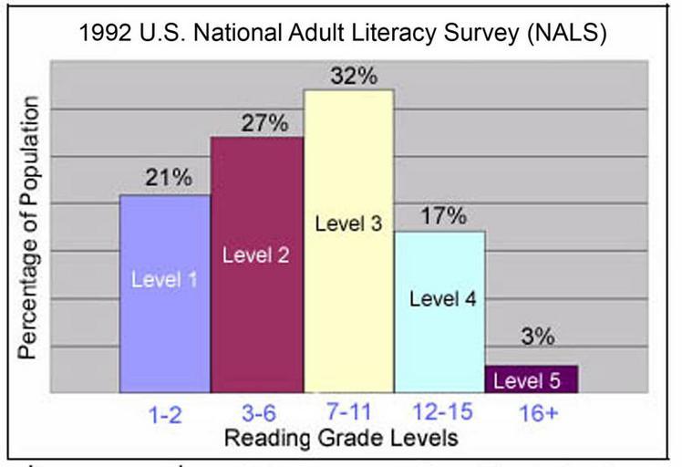 Keywords: Nals.jpg en A chart representing the results of the 1992 National Adult Literacy conducted by the U S National Assessment of Educational Progress own Bdubay Cc-zero 1992 in the United States Literacy Bar charts Diagrams in English