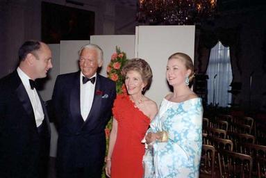 Keywords: Nancy Reagan Douglas Fairbanks, Jr. Grace Kelly.jpg First Lady Nancy Reagan posing with Douglas Fairbanks Jr and Grace Kelly Peter McCoy at far left during a dinner at Winfield House during trip to London for the Royal Wedding of Prince Charles and Diana Princess of Wales http //www reagan utexas edu/archives/photographs/large/C3326-14A jpg 1981-07-26 White House photo office PD as official government record PD-USGov Nancy Reagan after 1989 Douglas Fairbanks Jr Grace Kelly