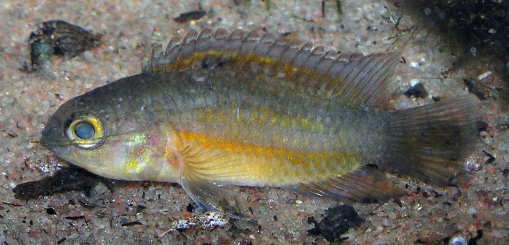Keywords: Nannacara anomala juvenile1.jpg SL in an aquarium Grønn dvergacara Nannacara anomala ungdyr ca 2 cm SL i et akvarium own Soulkeeper 2009-02-19 Nannacara anomala