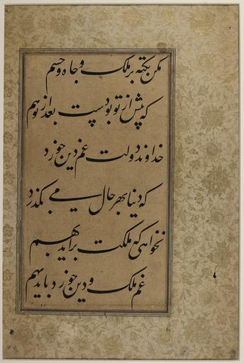 | Keywords: Nasihat verso.jpg Dimensions of Written Surface Recto 13 8 w x 24 7 h cm Dimensions of Written Surface Verso 14 w x 25 h cm Script nasta'liq This fragment includes an excerpt from Sa'di's d 691/1292 Bustan The Fruit Orchard in which he offers advice nasihat to a ruler The author counsels a king not to worry about what he does not have because all things come to an end He also notes that good deeds matter as only a man's reputation and memory remain Sa'di's text continues on the fragment's verso 1-86-154 140 V as evidenced by the similar subject matter and the continuation of the catchwords makun takiyah in the lower left corner of the recto The calligraphic fragment is executed in black nasta'liq script in horizontal and diagonal lines on a beige folio decorated with polygonal motifs highlighted in gold Various text panels are framed by simple borders creating a complex web of verses in a quilt-like pattern The text panel is framed by several borders and pasted to blue paper decorated with flower and medallion motifs painted in gold The folio's layout and style are typical of works produced in Safavid Persia Iran during the 16th century The number 24 appears in the lower right corner of the text panel while the number 25 appears on the fragment's verso These numbers suggest that these two calligraphic fragments belonged to a larger work either a more complete copy of Sa'di's Bustan or an album of calligraphies The verso of this fragment also includes an excerpt from Sa'di's Bustan in which he offers advice to a ruler It continues the text on the fragment's recto as noted by the similar subject and the catchword in the recto's lower left corner 1-86-154 140 R The verses here read Makun takiyah bar mulk u jah u hasham / Ka pish az tu bud ast u ba'd az tu ham / Khudavand-i dawlat gham u din khurad / Ka dunya bi-har hal mibiguzarad / Nakhwahi ka mulkat barayad bi-ham / Gham-i mulk u din khurd bayad bi-ham Don't lean on rulership glory and your retinue / Which were there before you and will be there after you / The Lord of Government has to pay attention to religion / Because the world certainly will end / If you don't want your kingdom to disappear with it / Then be aware both of power and religion as they go together Here Sa'di warns a ruler that he must respect both earthly power mulk and spiritual affairs din as they complement each other Much like God khuda supervises religious well-being the king too as Lord of Government khudavand-i dawlat must administer wisely The verso of this calligraphic fragment is executed in a large crisp nasta'liq script in black ink on a beige folio framed by several borders and pasted to cream-colored paper decorated with flower and vine motifs painted in gold The layout and style of the pages are typical of works produced in Safavid Persia Iran during the 16th century ascs 152 century 16 author PD-old thumb left Recto Bostan Safavid art Nastaliq |